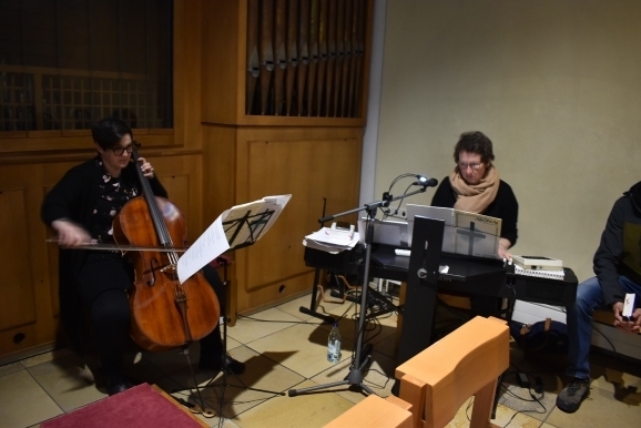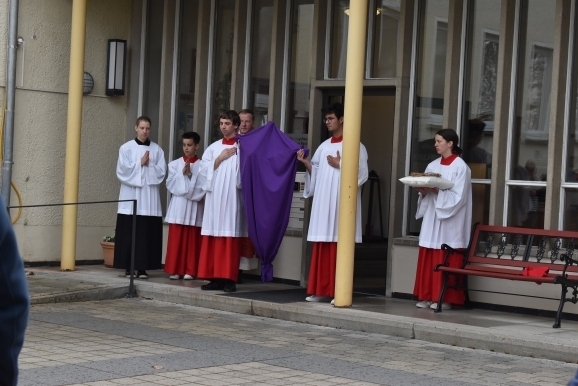 Das Wetter war genau bis zum Ende der Geschichte trocken, die im großen Saal ihren Anfang nahm und in der Kapelle mit der Verehrung des Kreuzes, der Hl. Kommunion und dem Segen endete. Auch viele Kinder nahmen teil und verfolgten mit Spannung und großen Augen und Ohren das Geschehen. Auch sie waren teilweise aus der Einkehrtage-Gruppe und hatten während dieser Zeit ein wunderschönes Kreuz aus Stoffbahnen u.a. Utensilien gebastelt.