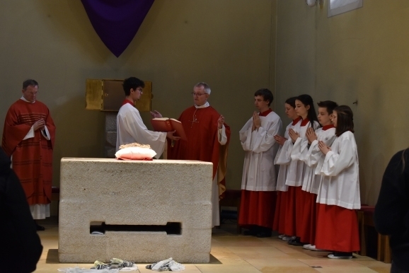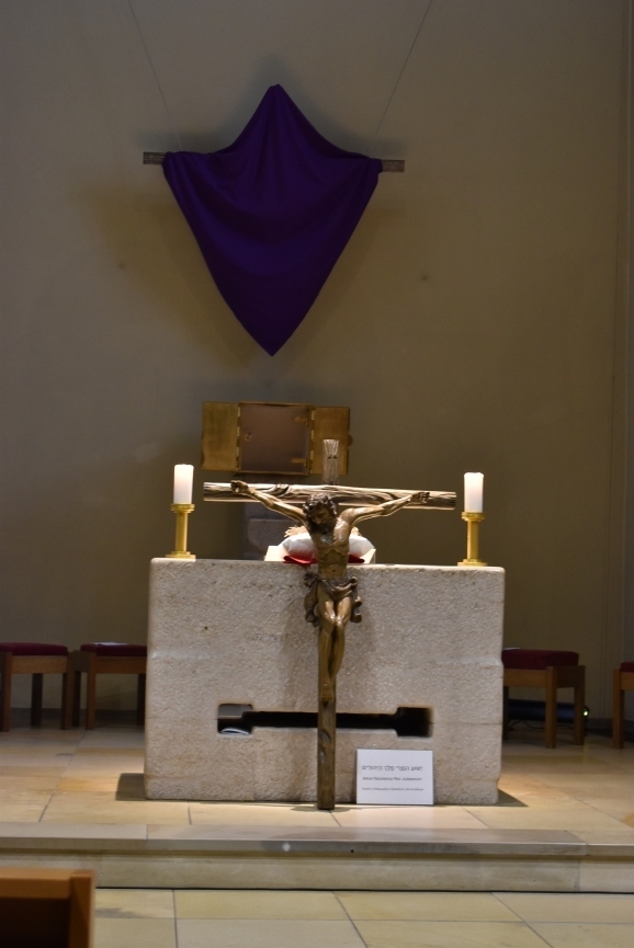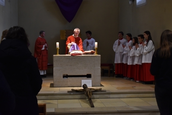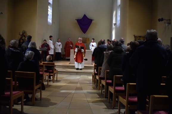 Weiter ging nun „der Kreuzweg“ in die Kapelle hinein, alle Gläubigen folgten und fanden Platz. Das Kreuz wurde enthüllt und alle Besucher konnten dem stattlichen Holzkreuz mit Christusstatue ihre Ehre erweisen. Pater Gabriel verlas die vielen Fürbitten, die am Karfreitag Tradition haben, um für viele verschiedene Gruppen zu beten, auch für die, die nicht dem christlichen Glauben folgen können. Nach der Kommunion und dem Segen war nach fast zwei Stunden diese feierliche Passion zu Ende.