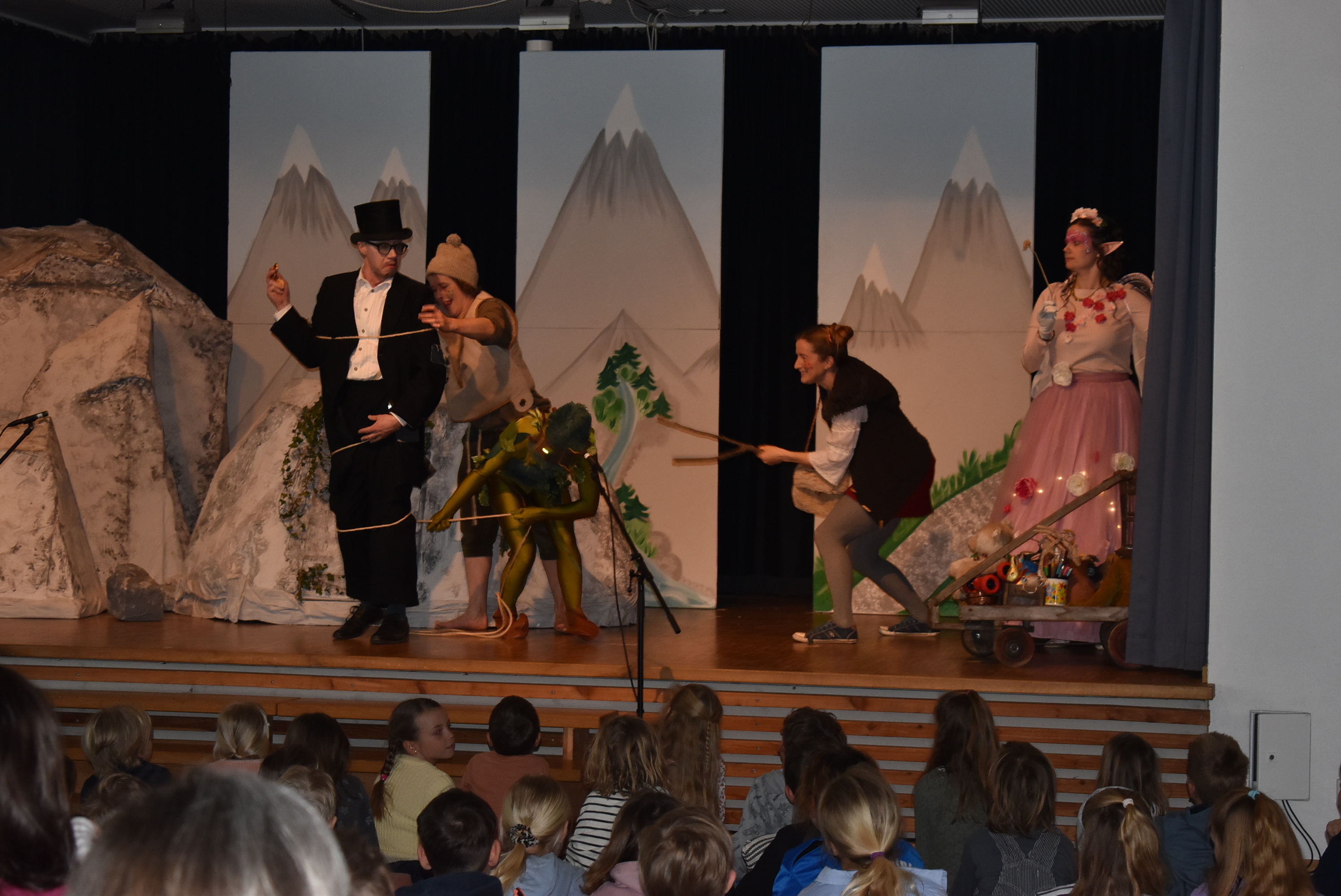 Verraten wird im Vorfeld nicht viel, aber da ist die pfiffige Gwendolin, die keine Angst hat, durch den gefürchteten Glimmerwald zu gehen, wo es Stein-Monks gibt, um den großen Berggeist zu finden. Sehr elegant wird die hübsche Flatterfee gespielt und auch der kluge Kerzenkobold ist ein lustiger und intelligenter Geselle, der die Zuschauer immer auf die nächste Szenerie vorbereitet. Das große Rätsel um den Berggeist wird gelöst und die Menschen im Tal können bald wieder aufatmen….
