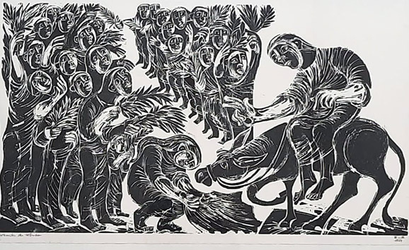 Es ist bemerkenswert, dass Schwester Sigmunda sich schon vor diesem allgemeinen Holzschnitt-Boom für diese Technik entschieden hat und eben auch viele Drucke im Gemäldeformat schuf, so wie zum Beispiel diejenigen, die jetzt in der Galluskapelle hängen. Das hat sicher auch mit ihren Kontakten zu HAP Grieshaber zu tun. Der hielt in den Nachkriegsjahrzehnten, in denen eher die ungegenständliche Malerei den Ton angab, die Tradition des figurativen Holzschnitts hoch. Gerade zu Sießen, wo der Künstler 1963 bei seinem legendären Osterritt Station gemacht hatte, bestand eine besondere Beziehung.