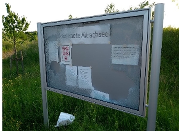 Um so unverständlicher ist es, dass gerade hier nach dem WC-Container nun auch noch die Scheibe an der Aushängetafel am Eingang zum Gelände eingeschlagen wurde.