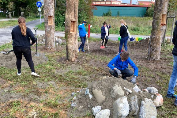 Auf der gesamten Projektfläche haben die Schüler kleine Steinhaufen aufgeschichtet und die Lücken dazwischen mit lockerer, sandiger Erde befüllt. „Diese offenen Flächen mit lockerem Boden und Felsspalten sind für viele Bienenarten, wie beispielsweise Sandbienenarten sehr wichtig“, erklärt Ranger Tobias Boneberger. „Tatsächlich nisten die überwiegenden Arten der über 500 in Deutschland vorkommenden Bienenarten im Boden“, so der Ranger. Außerdem wurde ein kleiner Naturteich mit lehmigem Untergrund angelegt. Diese Wasserstelle sei ebenso wertvoll für die Bienen, da sie dort Wasser schöpfen können.