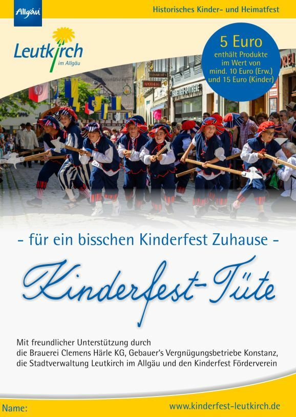 Eine Vorbestellung der Kinderfesttüten ist aus organisatorischen Gründen notwendig. Das Bestellformular mit möglichen Abholterminen erhalten Sie auf www.kinderfest-leutkirch.de und in der Touristinfo Leutkirch. Bestellschluss ist am Montag, 28. Juni 2021.
