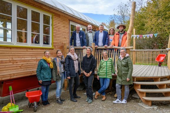 Leutkirch - Auf der Leutkircher Schillerhöhe wurde eine zweite Gruppe des DRK-Waldkindergartens eingerichtet. Gemeinsam mit den Erzieherinnen und Verantwortlichen des DRK wurde am vergangenen Montag der offizielle Start der neuen Gruppe mit der Übergabe des „Zirkuswagens“ – dem Schlechtwetterquartier – gefeiert.