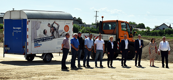 Leutkirch (sita) - Was bereits 25 Jahre lang in diversen Köpfen und später als Beschluss gefasst in Schubladen der Ämter lag, ist nun im Jahr 2022 wahr geworden: Der Startschuss für die Bebauung des großen Gebiets am Stadtrand von Leutkirch, zwischen der Umgehungsstraße-West und dem Industriegebiet Nadlerstraße/Ströhlerweg ist erfolgt. Statt des klassischen Spatenstichs mit Schaufeln gab es eine kleine Pistenfahrt durch das Gebiet. In Kooperation von Stadt und Volksbnak entsteht dort ein Mischgebiet. Während die Volksbank Allgäu-Oberschwaben 110 Mietwohnungen anbieten wird, vermarktet die Stadt Leutkirch Grundstücke für Einfamilienhäuser und Doppelhaushälften.