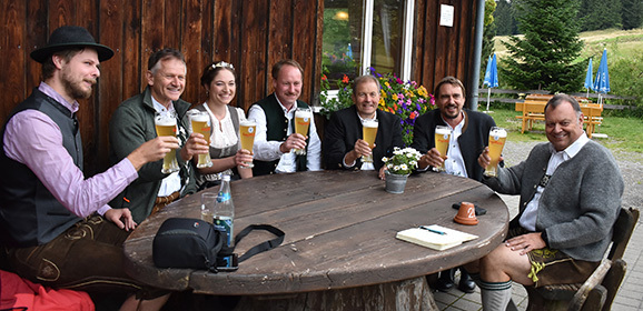 Kreuzthal / Leutkirch - Eingeladen hatte der Weitnauer Bürgermeister Florian Schmid zum Treff der AGA – der Angrenzenden Gemeinden an die Adelegg – mit der frisch gekürten bayerischen Bierkönigin Mona Sommer, ebenfalls wohnhaft in Weitnau, die in Leutkirch bei der Brauerei Härle als Bierbrauerin arbeitet. Gekommen war nicht nur sie im schicken Dirndl, auch die Bürgermeister der umliegenden Gemeinden und OB Hans-Jörg Henle aus Leutkirch ließen es sich nicht nehmen, in Lederhosen auf die Alpe zu kommen.