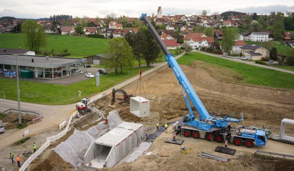 Leutkirch-Herlazhofen - Die ersten Betonelemente für die gut 22 Meter lange Rad- und Gehwegunterführung in Herlazhofen wurden gestern angeliefert und eingebaut.