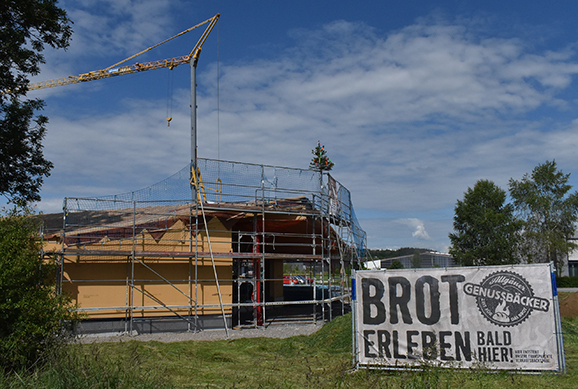 Leutkirch (sita) - „Immer eine Brotlänge voraus“ – das ist nicht nur ein Motto des Schaffens von Bäckermeister Leonhard Menig, seit 2018 in der Urlauer Genussmanufaktur tätig, das gilt auch für seinen Neubau westlich von Leutkirch, an der Wurzacher Straße, kurz vor dem Autobahnanschluss: In kürzester Zeit entstand ein Holzrahmenbau von fast 500 qm, wo voraussichtlich ab Herbst 2022 nicht nur eine Bäckerei mit Café inklusive überdachtem Außenbereich zum Einkaufen und Genießen einlädt, sondern auch eine gläserne Backstube, wo jeder Kunde sich vom kunstvollen Brotbacken von Menig mit Team überzeugen kann.