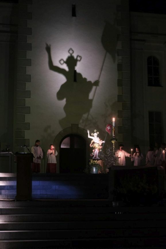 Bad Wurzach - Bei der österlichen Auferstehungsfeier auf dem Klosterplatz vor St. Verena symbolisierten die Christusfigur und der Auferstandene nicht nur die Hoffnung der Christenheit, sondern durch eine geschickte Licht- Schattenprojektion auf den Kirchturm auch den Mahner in den schwierigsten Zeiten seit dem Zweiten Weltkrieg.