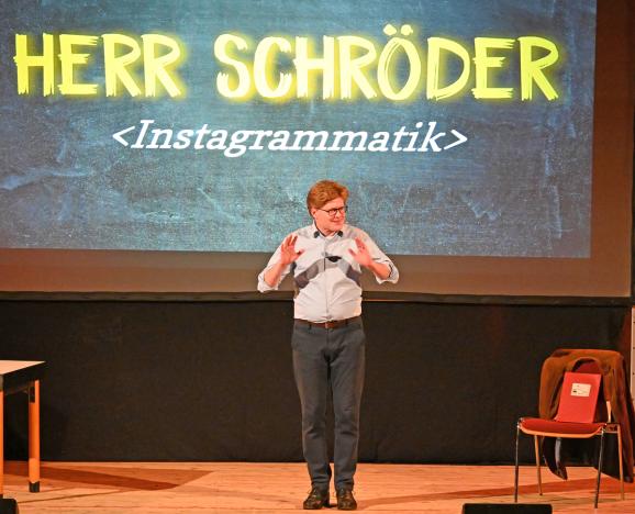 Bad Waldsee - Ein Wunsch des Gymnasiums zum 50igsten Geburtstag ging in Erfüllung. Spektrum K brachte mit Herrn Schröder einen wortwitzigen Kabarettisten und Lehrer auf die Bühne. Schade, dass nicht mehr als vielleicht 150 Zuschauer den Weg in die Stadthalle fanden.